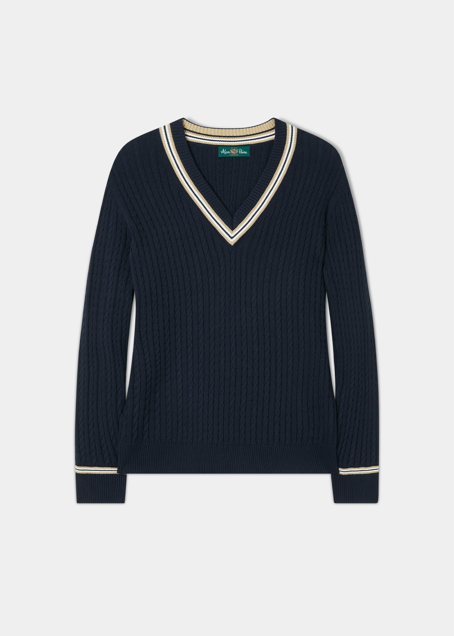 New for the season, a long-awaited ladies version of our iconic cricket sweater in Navy with a Pine Nut and Ecru trim. This modern day classic is crafted from beautifully soft pure cotton and features our signature cable structure. Enhanced by feminine colours and trims, embrace the current trend for contemporary sportswear by wearing on its own or pop over a shirt for a more classic look. Experience a piece of our history, your wardrobe will be forever grateful.